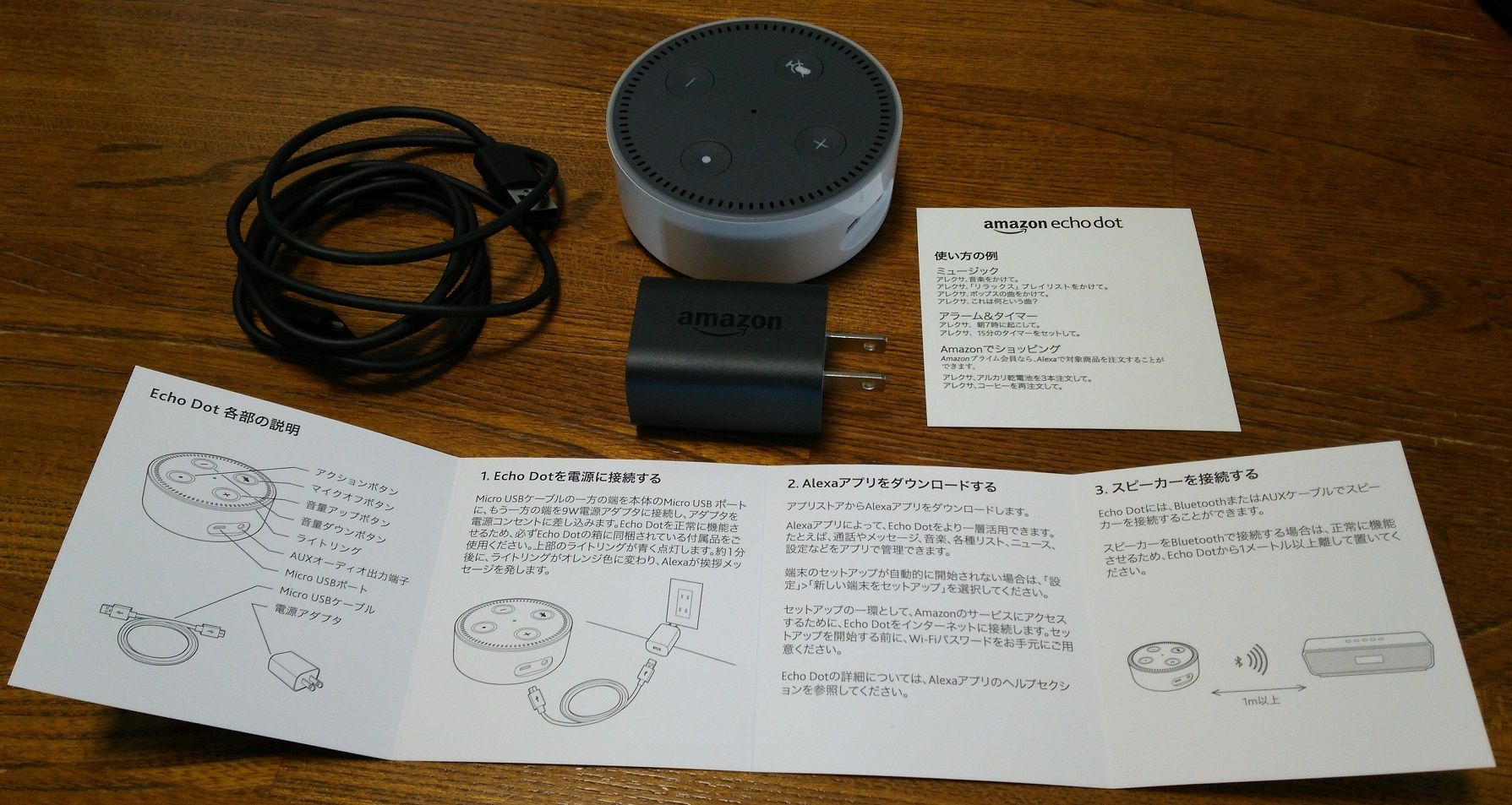 昨夕7/20、3点の商品が届きました。3点とも伊豆別荘で使用する予定ですが、今日は、echo dot が使用できるか確認してみました。箱には、本体とACアダプター、USBケーブルが入っていました。