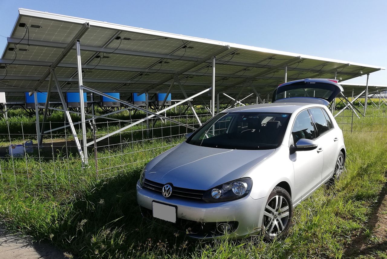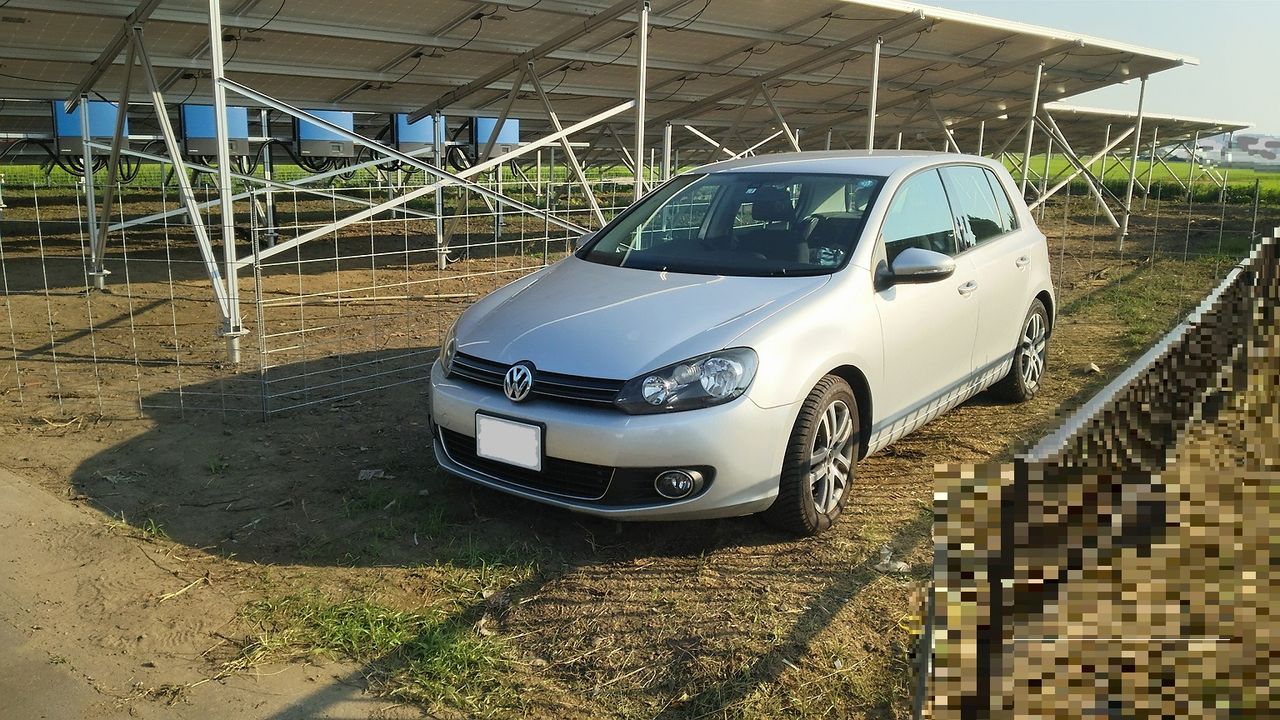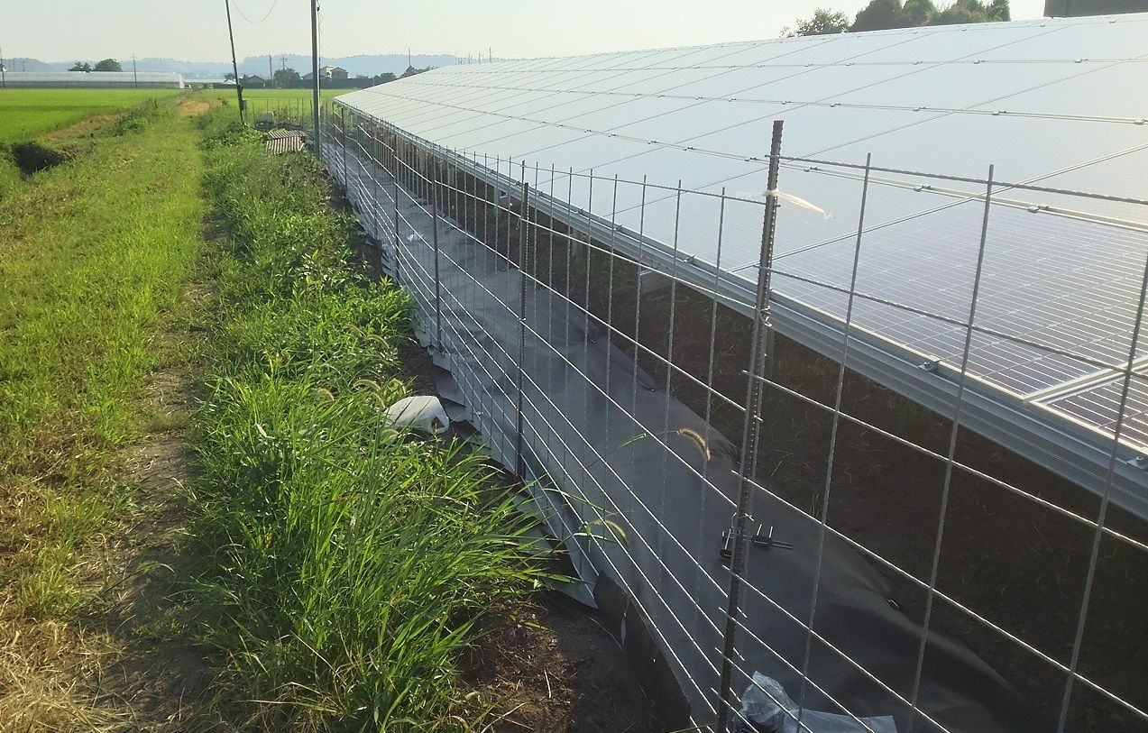 5号基は900㎡ほどの土地に300枚のソーラーパネルを並べたためアレイ間隔が1.2mしかありません。このままでは冬至の頃に前列アレイの影の影響がでます。これを避けて日射量を確保するため、後列アレイを前列より40㎝高くしました。(詳細はこちらの記事をご参照ください) この変更が副次的に雑草による影響への対策としても機能(パネルが高くなるため雑草が届きにくい)していることが確認できました。(^^♪