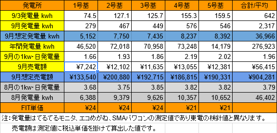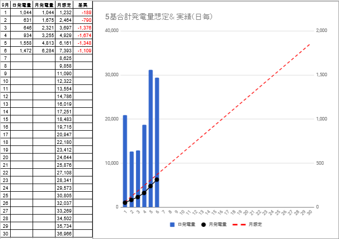 9/6迄の発電量は、6,284kwhで想定発電量との差異は、-1,348kwhから-1,109kwhに減少しました。5号基が売電していることが判明し、ほっとしました。