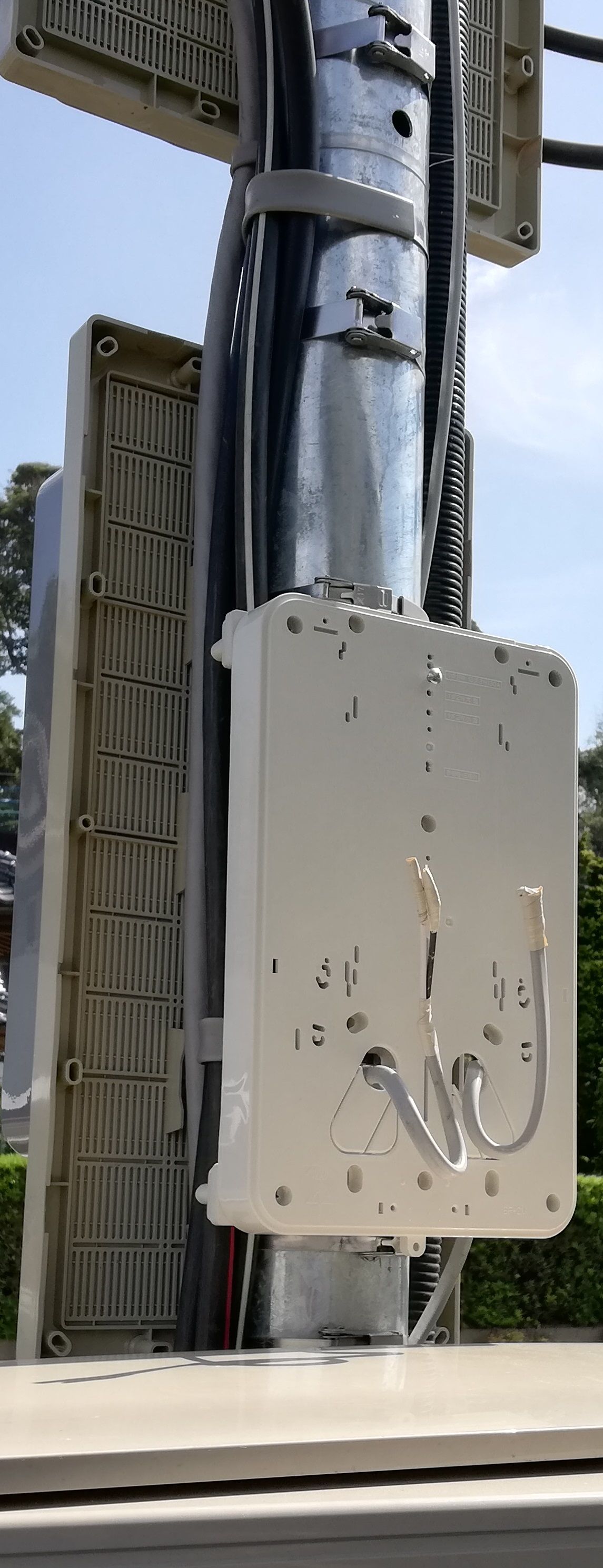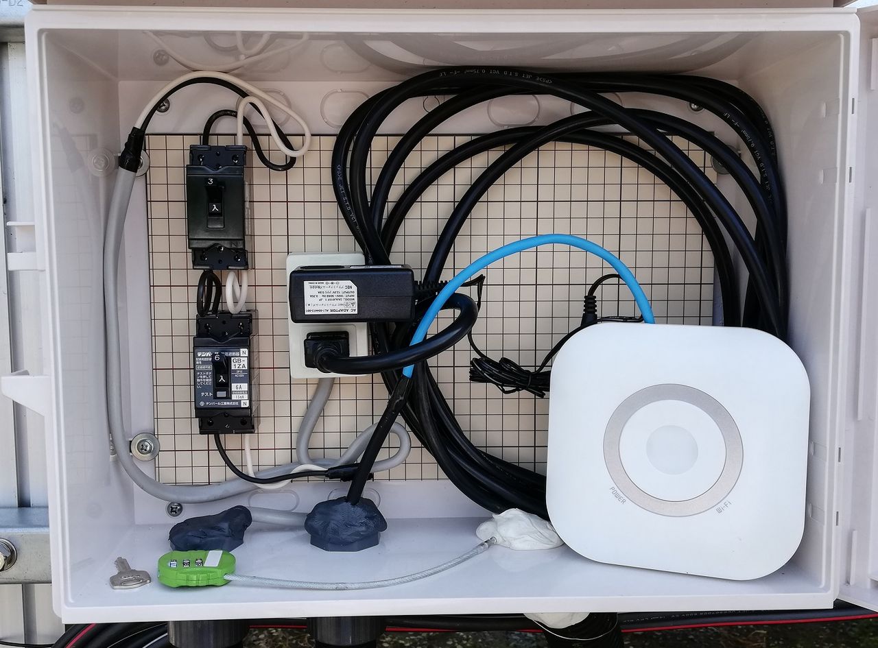 次に、LTEルータを収容しているプラボックスを確認しました。こちらもブレーカーはオンになっていますが、LTEルータに電源が供給されていないようです。監視カメラもこの電源コンセントに接続していますので、このブレーカーにACが来ていないことになります。