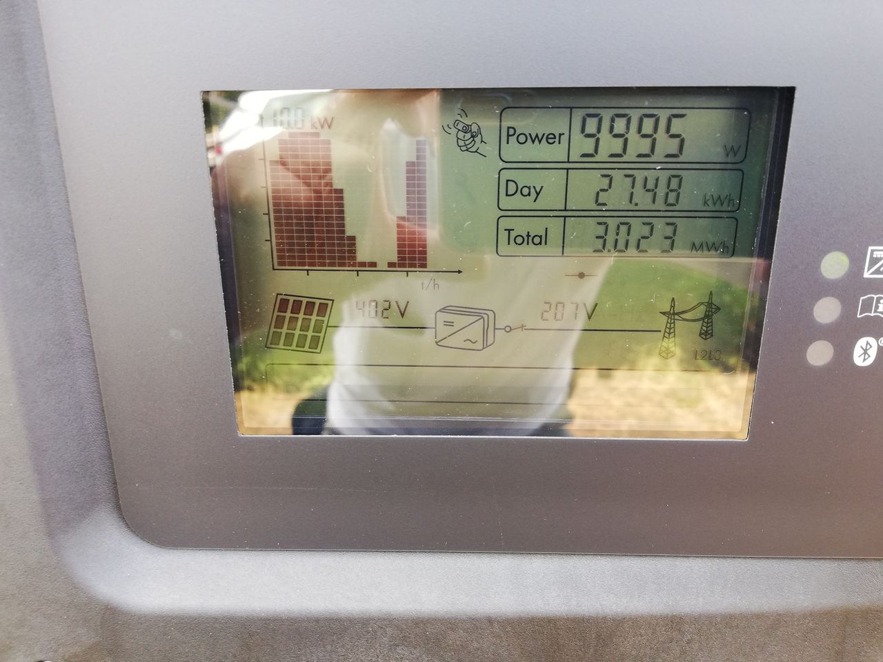 パワコンに近づくとファンの動作音が聞こえ、LCDにデータが表示されていました。パワコンは正常に動作しています。