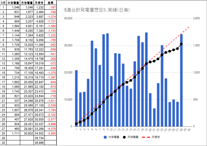9/28迄の発電量は30,602kwhで想定発電量との差異は-4,378kwhから-3,900kwhに改善しました。