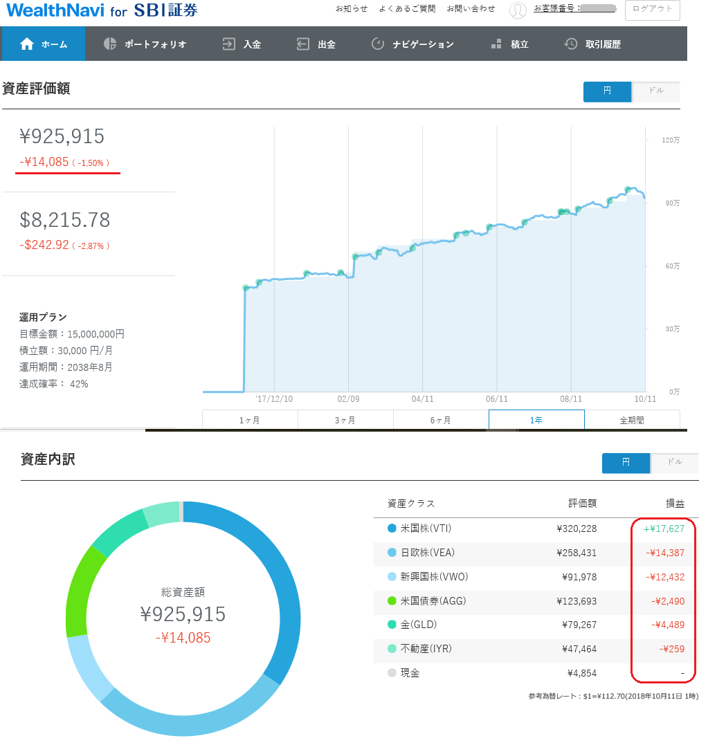 今日のWealthNaviです。前回9/22の記事(こちら)では、+33,367円(+3.67% 2017/11~)の評価益がありましたが、-14,085円 でマイナス転換しました。