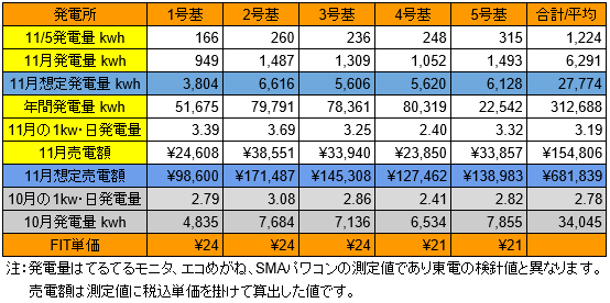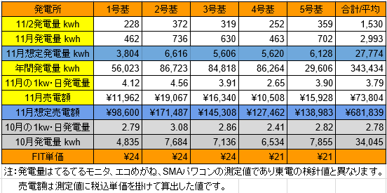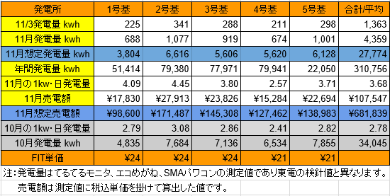 それでは、昨日11/6の発電量です。(各発電所の仕様はこちらです)