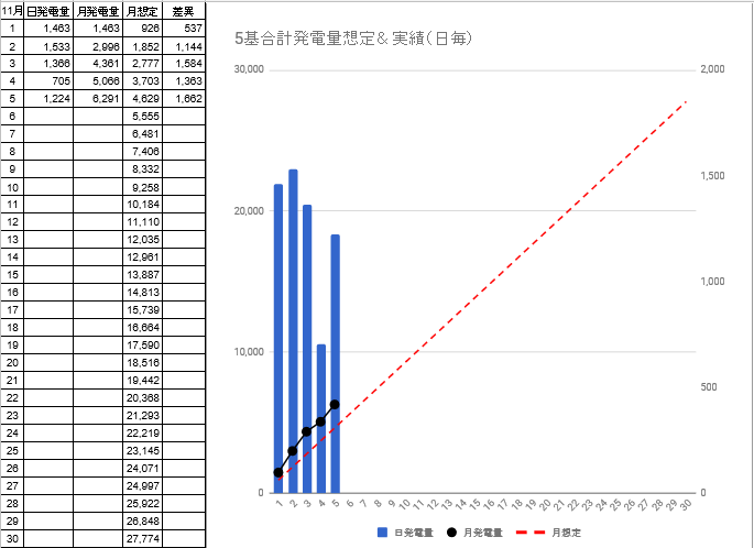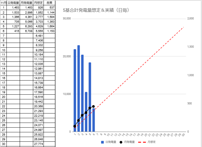 11/6迄の発電量は6,708kwhで想定発電量との差異は+1,664kwhから+1,153kwhに減少しました。今日11/7はまずまずの好天でした。好天が続いて欲しいと思います。