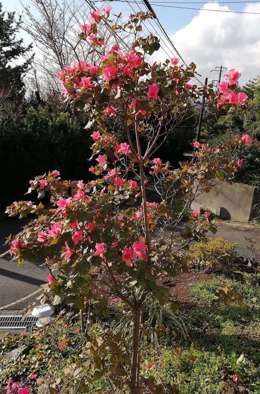 昨日の夕方、雨が降る中を横浜から伊豆高原へ移動しました。今日11/7は、日中は温かくてまずまずの天気です。庭を見ると、1本の つつじ が満開に咲いていました。
