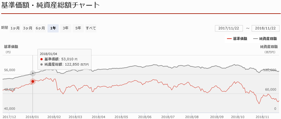 一方、ひふみ投信は 1/4の53,010円から45,087円まで7,923円(-14.9%)も値下がりしていました。今年のパフォーマンスは良くないですね。