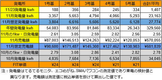 それでは、11/23の発電量です。(各発電所の仕様はこちらです)