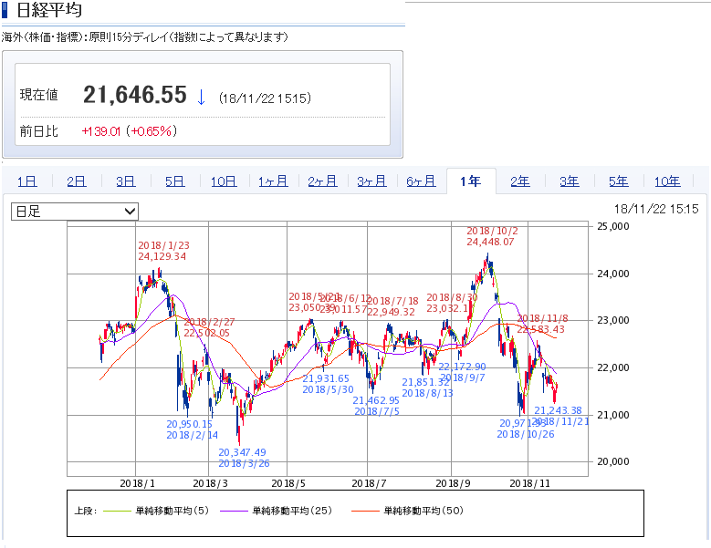 年初1/4の終値23,506.33円から11/22終値21646.55円まで1859円(-7.9%)値下がりしています。