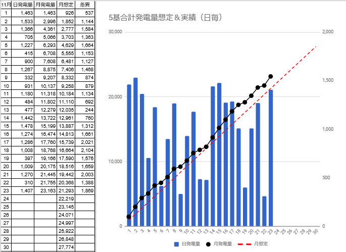 11/23迄の発電量は23,163kwhで想定発電量との差異は+1,388kwhから+1,869kwhに拡大しました。月末にかけて雨の天気予報はありませんので想定との差異がさらに拡大しそうです。(^^♪