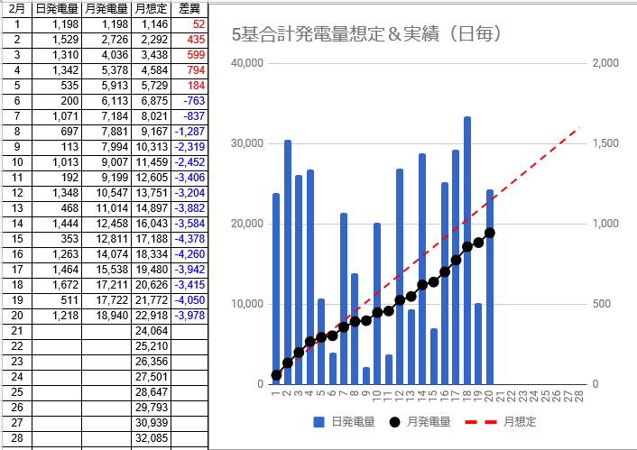 2/20迄の発電量は18,940kwhで想定発電量との差異は-3,415kwhから-3,978kwhに拡大しました。昨日2/20は好天でしたが、2/19の落込分をカバー仕切れませんでした。(^_^;)