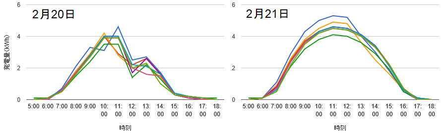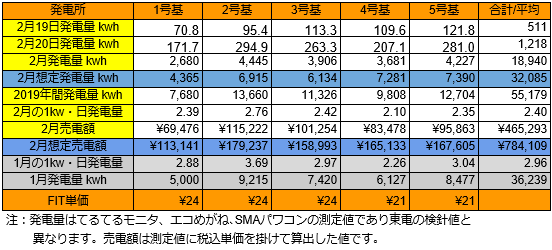 それでは2/19と2/20の発電量です。(各発電所の仕様はこちらです)