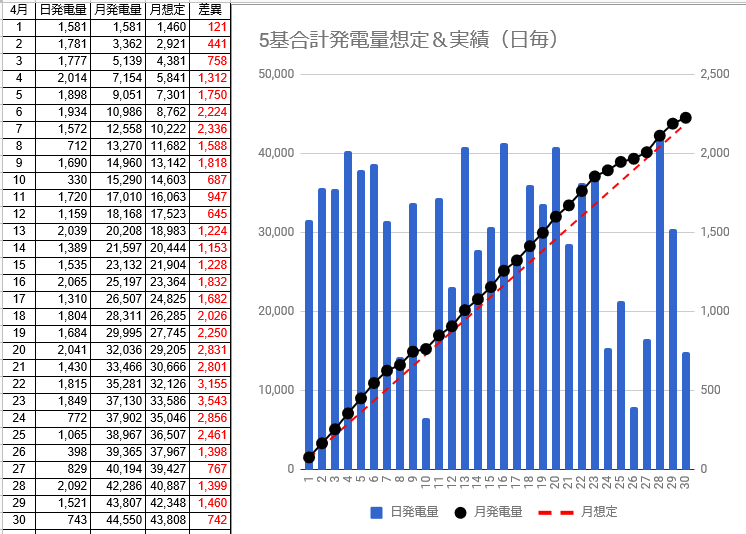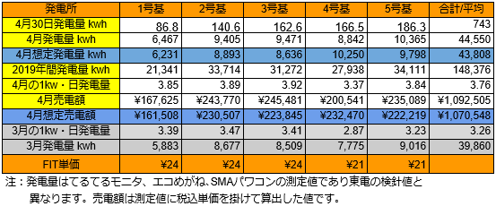 4/30の発電量を確認します。(各発電所の仕様はこちらです)