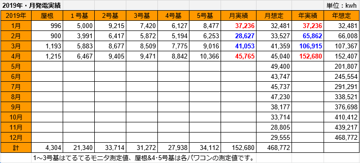 1月~4月の累計は152,680kwhで想定の152,407kwhを+273kwh超過しました。これで2月・3月のマイナスを取り戻しました。(^^♪ 5月もこの調子が続いて欲しいと思います。