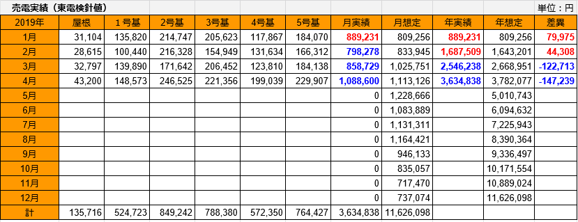4月度の想定売電額111万円に対して実績は108万円でした。1~4月の年実績も想定378万円を下廻る363万円です。