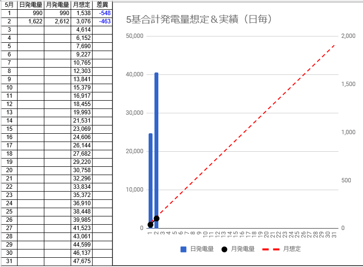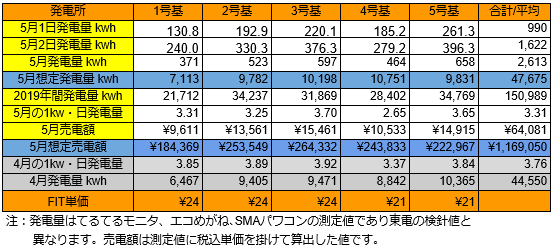それでは、5/1~5/2の発電量です。(各発電所の仕様はこちらです)