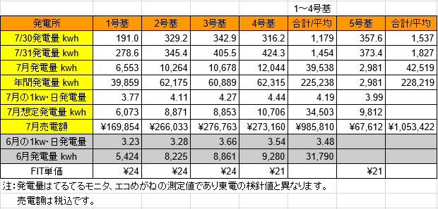 7/30の4基合計の発電量は1,179kwh、7/31は1,454kwhでした。1kw・日当たりの発電量は4.18から4.19kwhに僅かにアップしました。7/30の1~5号基の合計発電量は1,537kwh、7/31は1,827kwhでした。