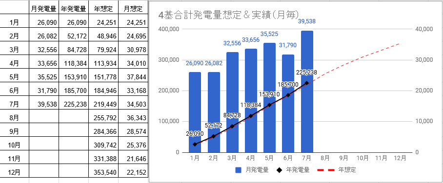 4基の7月発電量は、39,538kwhに達し、7月想定を5,035kwh上廻り想定の115%になりました。また、5月発電量と比べても113%に達しました。(^^♪