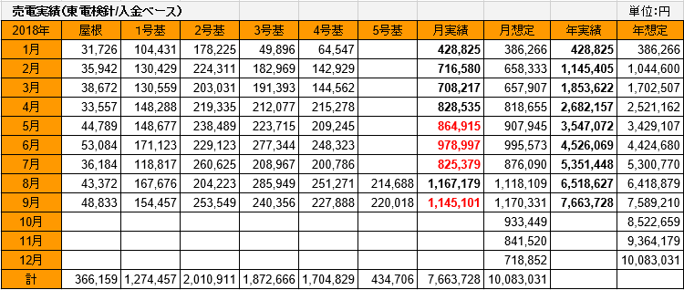 2018年9月の発電量は31,784kwhで想定発電量との差異は-5,182kwhで想定比86%になりました。