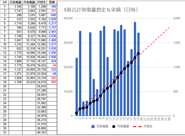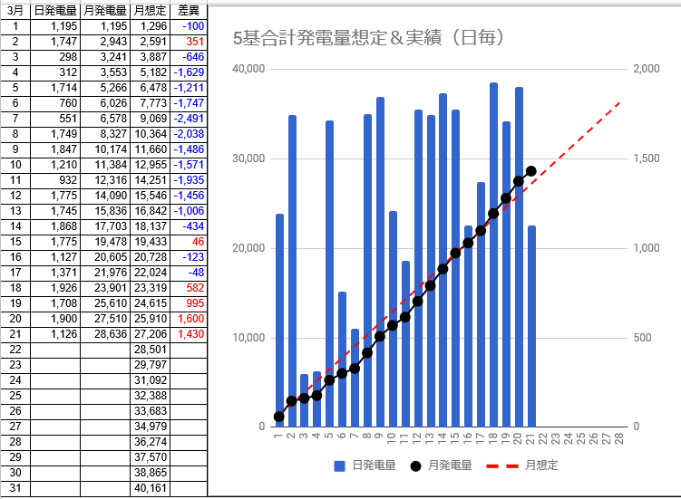 月間発電量は38,144kwhで想定発電量との差異は+1,522kwhから+574kwhに大きくダウンしました。今日3/30も曇り空のため想定との差異がマイナスになりそうです。(^_^;) 明日3/31の天気に期待したいと思います。