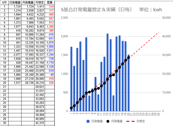 月間発電量は39,050kwhで想定発電量との差異は-624kwhから-3,265kwhに大きく拡大、想定比-7.7%の92.3%でした。今月ラスト3日間の失速が大きく影響しました。(^_^;)