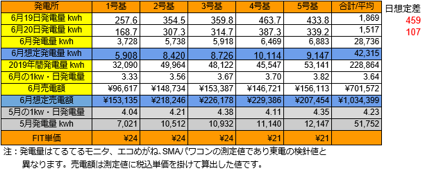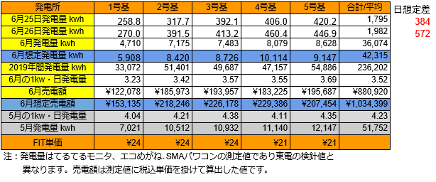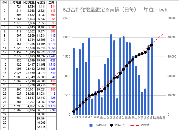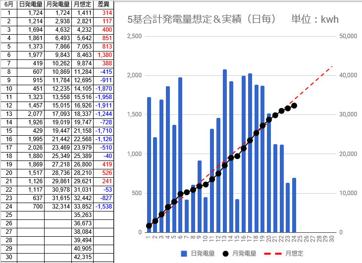 6/28の5基合計の発電量は831kwh(日想定差-580kwh)、6/29は419kwh(日想定差-991kwh)、6/30は僅か341kwh(日想定差-1,070kwh)でした。1kw・日当たりの発電量は3.52から3.30kwhにダウンしました。