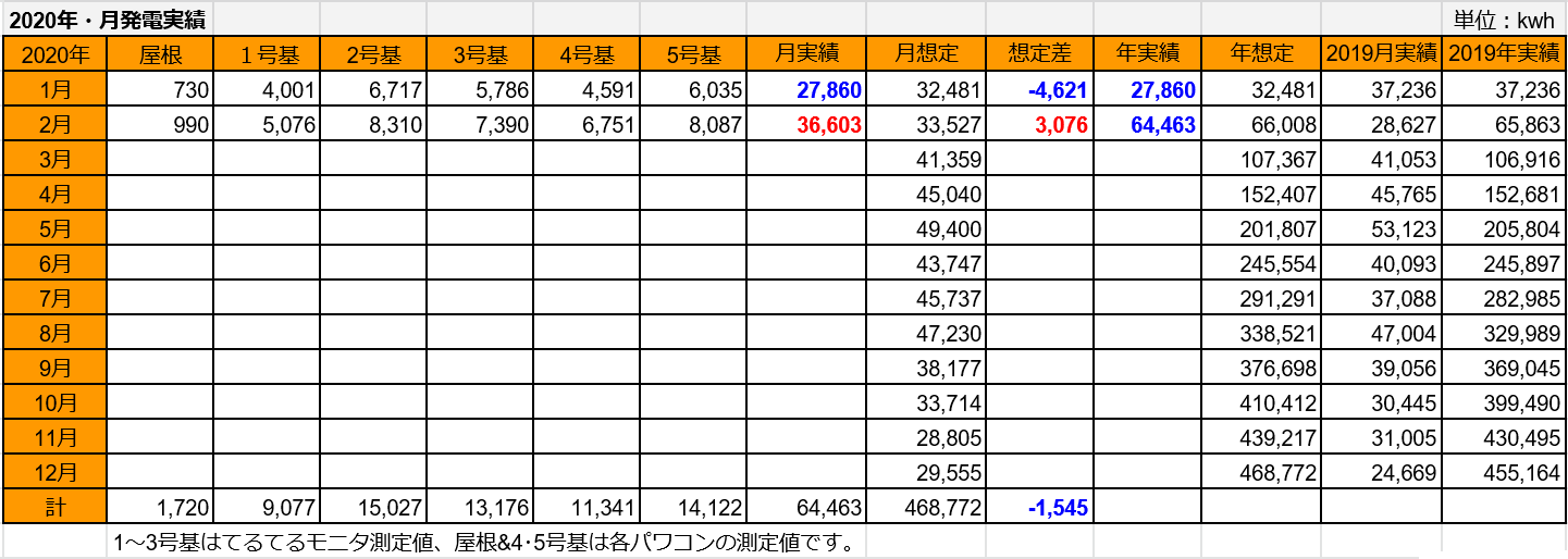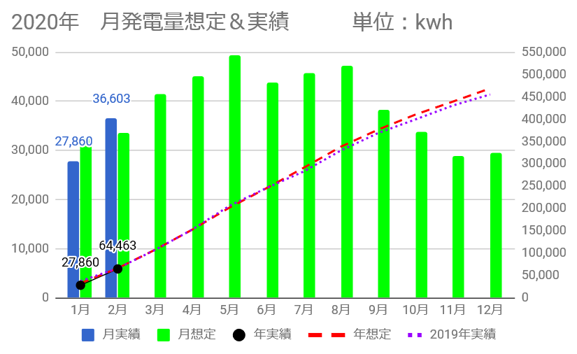 屋根を含めると36,603kWh(想定比109%の+3,076kWh)で、1月のマイナス全てを取り戻すことは出来ませんでしたが、差異を-1,545kWhまで縮めました。