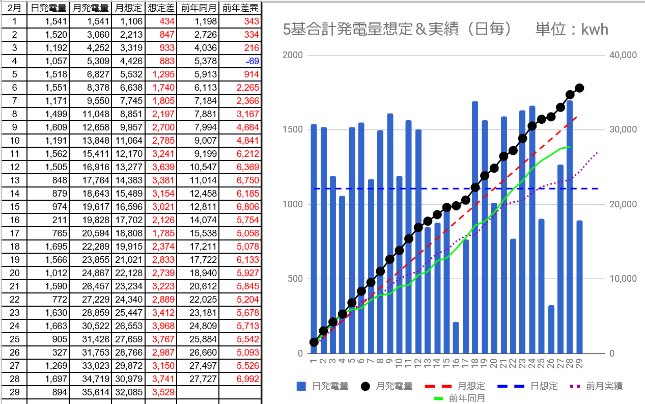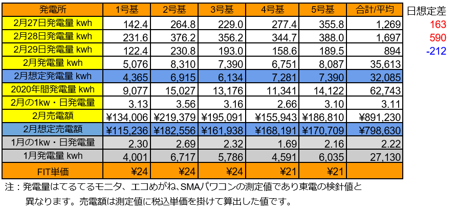 2/27の5基合計の発電量は1,269kWh(日想定差+163kWh)、2/28は1,697kWh(日想定差+590kWh)、2/29は894kWh(日想定差-212kWh)でした。パネル1kwあたり1日の発電量は3.09から3.11kWhにアップしました。