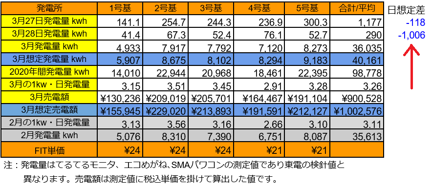 積雪があった3/29は、5基あわせて僅か286kWhに留まり想定比はマイナス4桁の-1,010kWhに達しました。(^_^;)