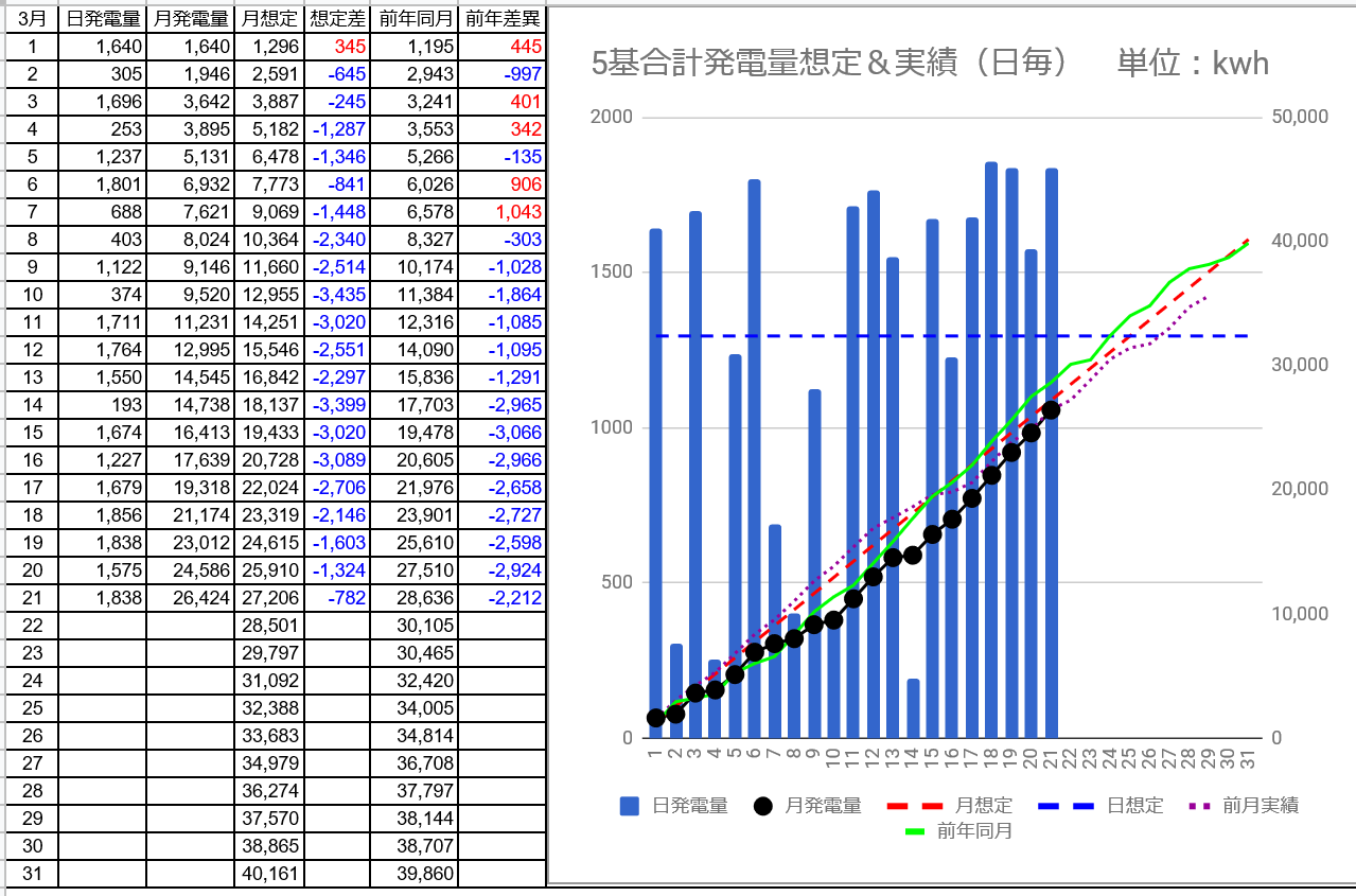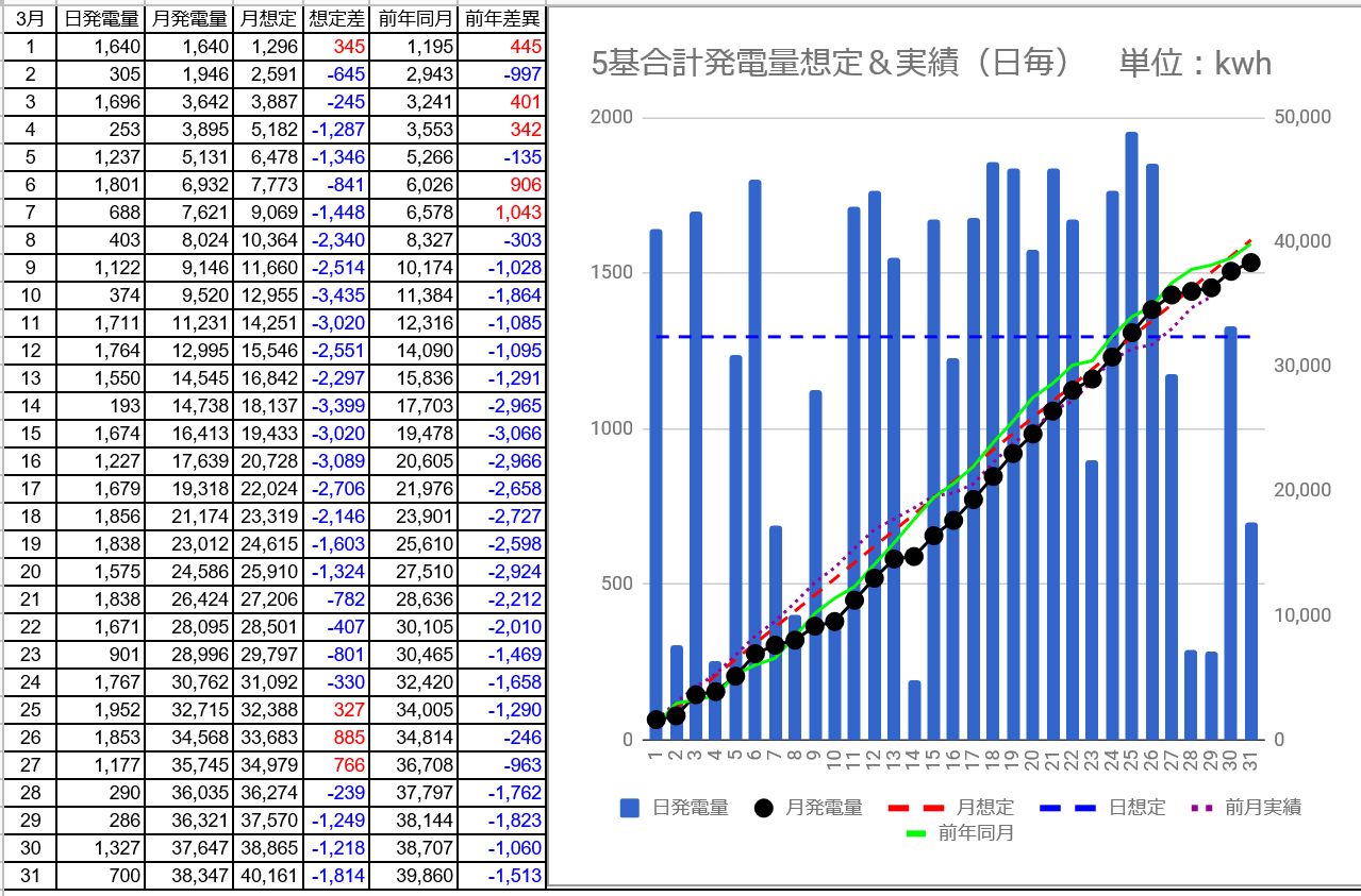 3月発電量は38,347kWhで想定との差異は3/28の-239kWhからー1,814kWhに拡大しました。