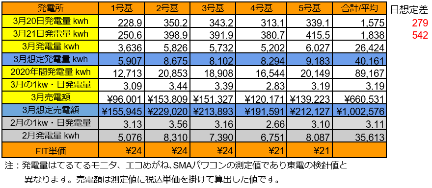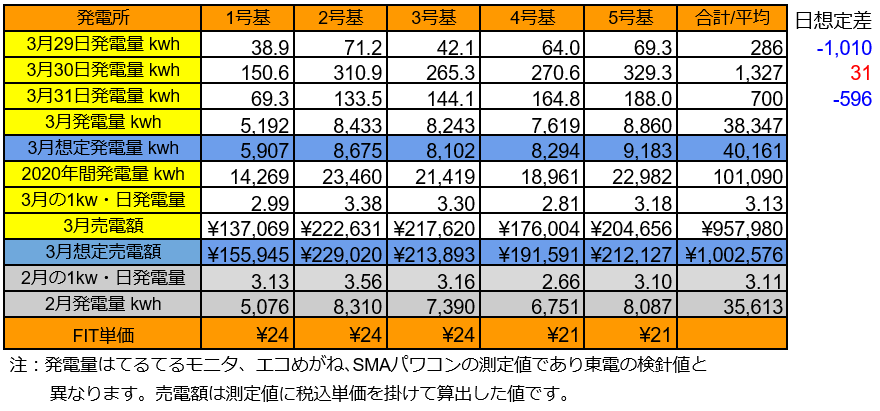 まずは、3/29~31の発電量を確認します。(各発電所の仕様はこちらです)