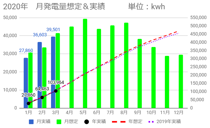 う~ん、合計103,964kWhで、こちらも想定との差異は-3,403kWhもあります。また、昨年1~3月合計より2,952kWh少ないですね。
