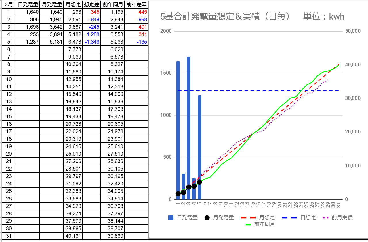 3/14の5基合計の発電量は僅か193kWh(日想定差-1,102kWh)、3/15は1,674kWh(日想定差+379kWh)でした。