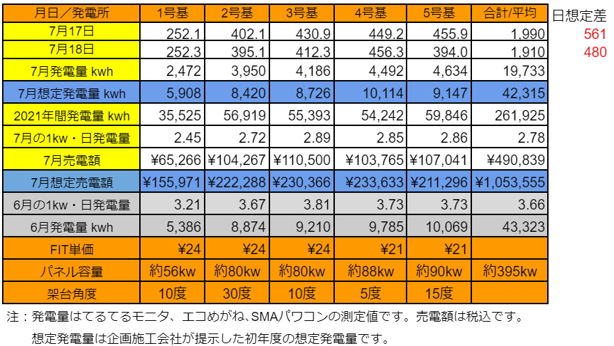 では、7月の発電量がどうだったか確認したいと思います。(各発電所の仕様はこちらです)