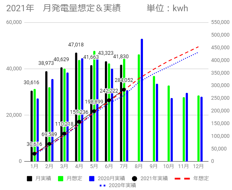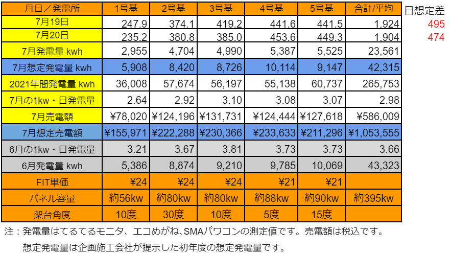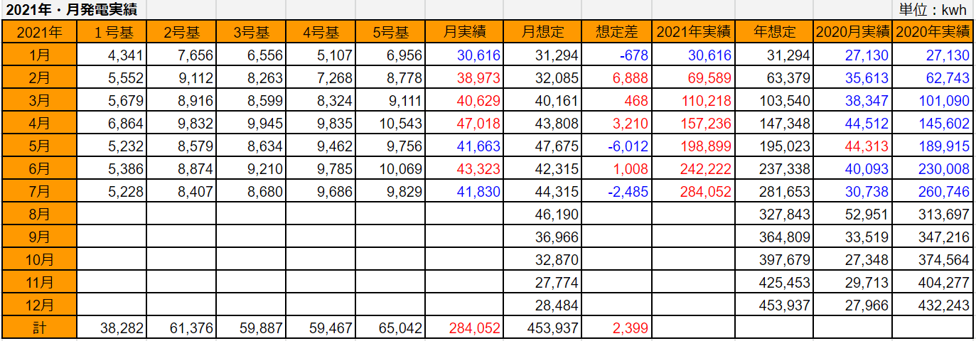 5基合計の7月発電量は、41,830kWhで想定差は-2,485kWhでした。それでも前年同月と比べると+11,092kWhの大幅超過でした。昨年7月は本当に酷かったことがわかります。