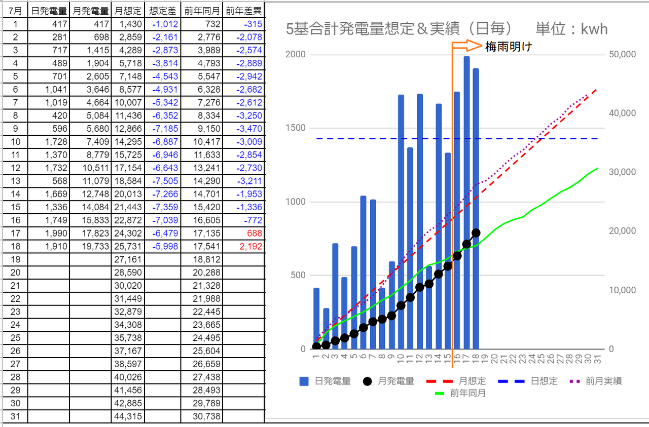 チャートで見ると月前半の発電量が少なく、梅雨明け後の月後半はかなり盛り返したことが良く分かります。