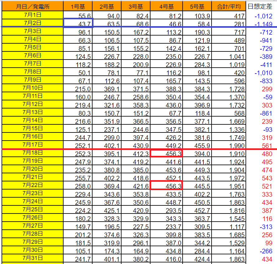 発電所単位では、最大は7/18および7/22の4号基の456.3kWh、最小は7/2の1号基43.7kWhです。