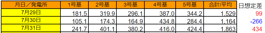 7/29の5基合計の発電量は1,529kWhで想定差は+99kWh、7/30は1,164kWhで想定差は-266kWh、7/31は1,863kWhで想定差+434kWhでした。