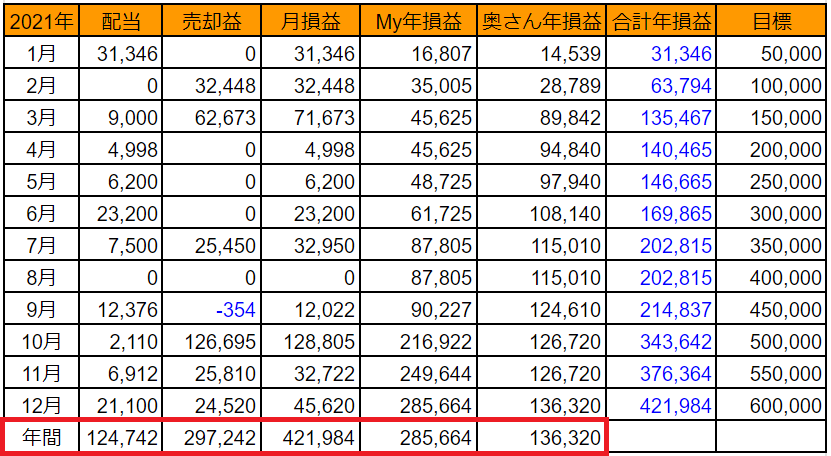 それでは、2021年間および月別の結果です。