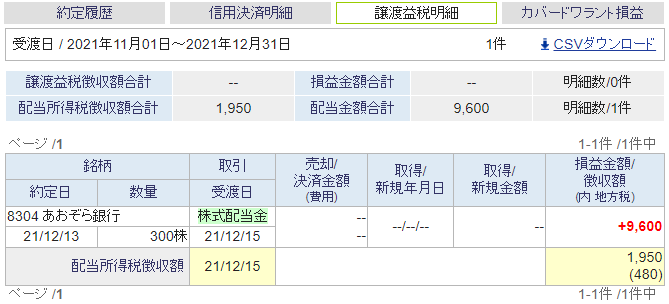 奥さん口座にはあおぞら銀行の配当がありました。