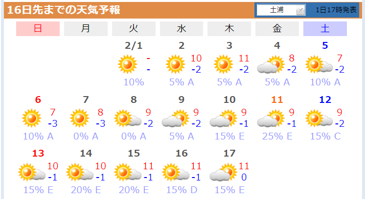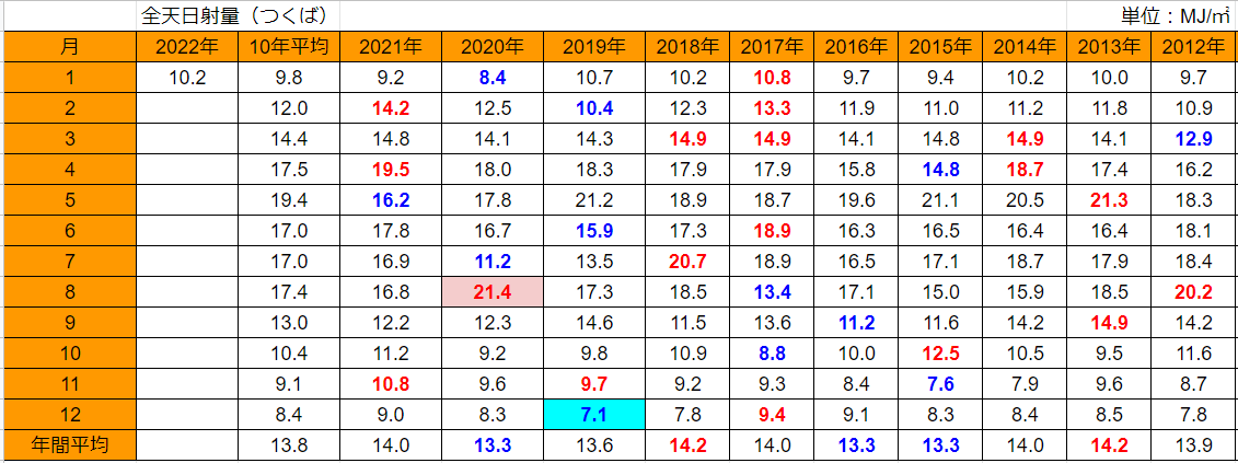 1月の日射量は、1/13迄の9.3MJ/㎡から10.2MJ/㎡にアップし、