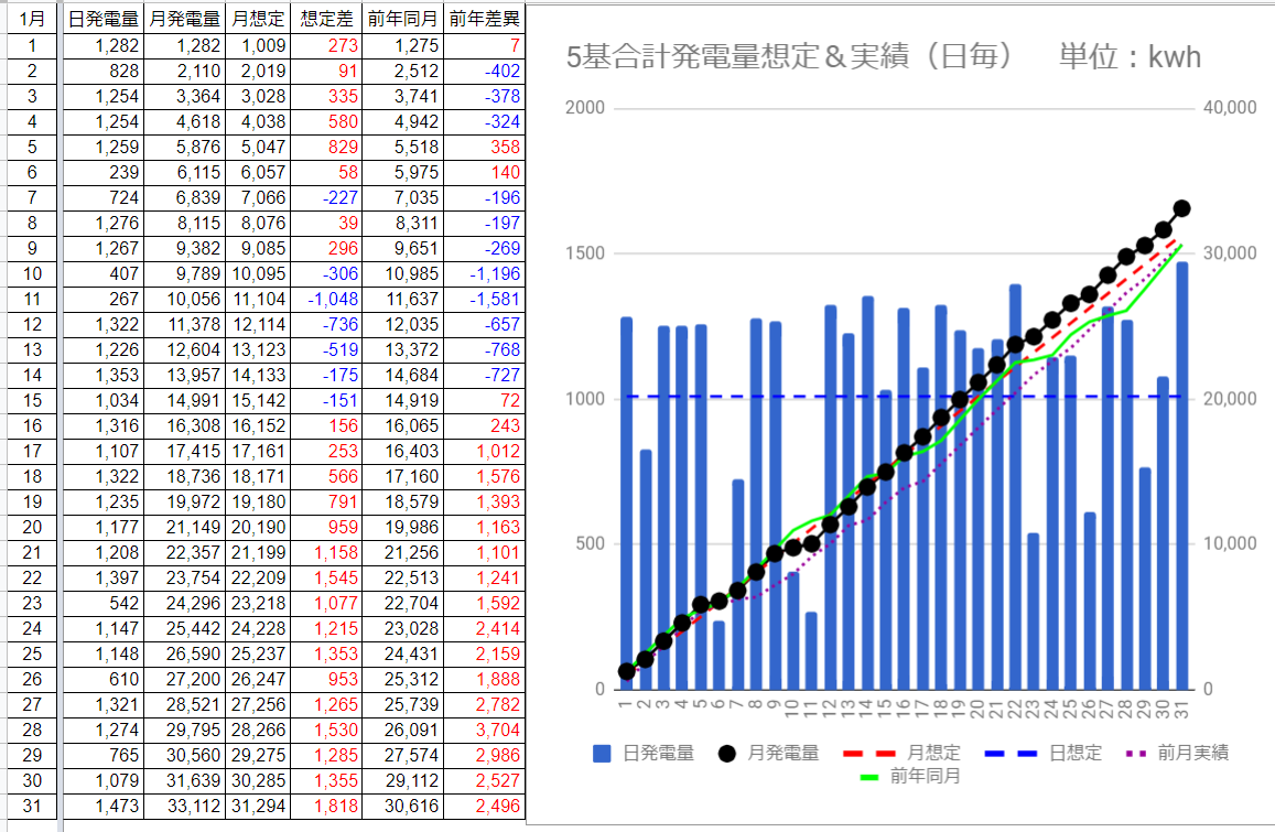 5基合計の発電量は33,112kWhで想定を1,818kWh (+5.8%)超過しました。(^^♪