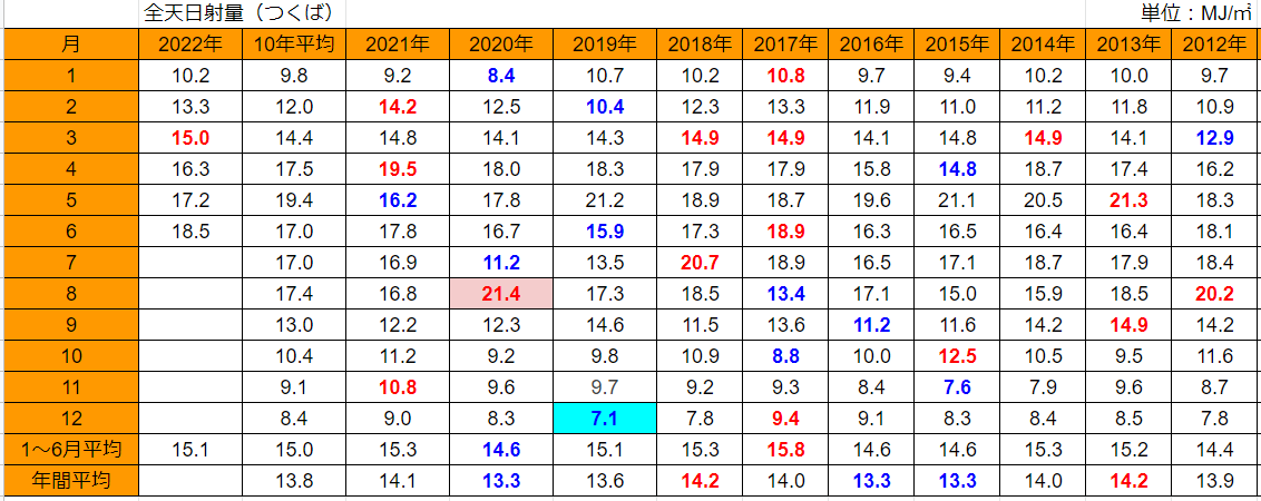 つくばの日射量は 18.5MJ/㎡ で過去10年で2番目の値です(1位は2017年の18.9MJ/㎡)。