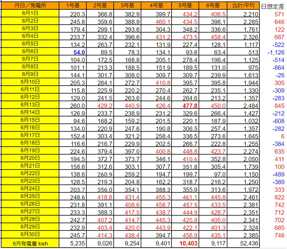 日別では6/13の2,484kWh(想定比+845kWh)、発電所単位ではやはり6/13の5号基477.8kWhが最大でした。
