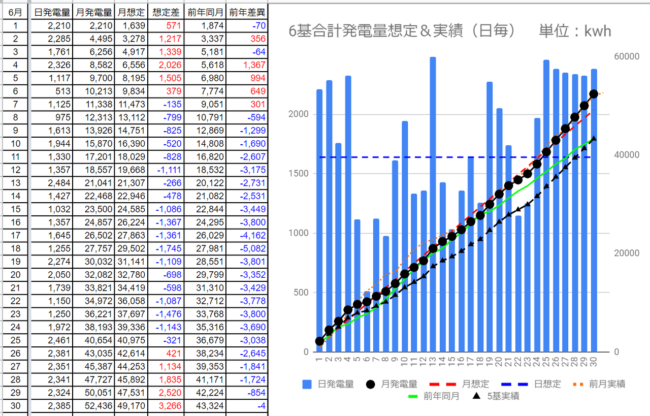 それでは、6月度の発電量です。(各発電所の仕様はこちらです)。