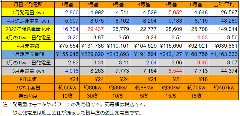 4号基の仕様:パネル約87kw、パワコン約50kw、南向き、仰角5度