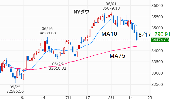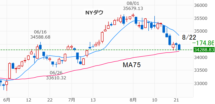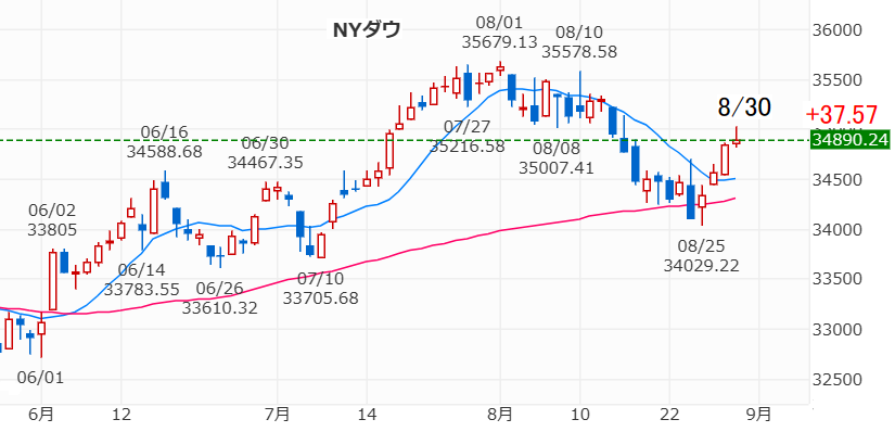 そして、米国8/30のNYダウは+37.57ドルの34890.24ドル、NASDAQも+75.55の14019.31とどちらも4日続伸しました。