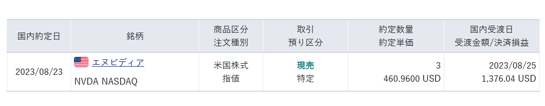 米国日付8/22に利確したエヌビディア3株の損益は結局 +17,464円 でした。