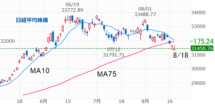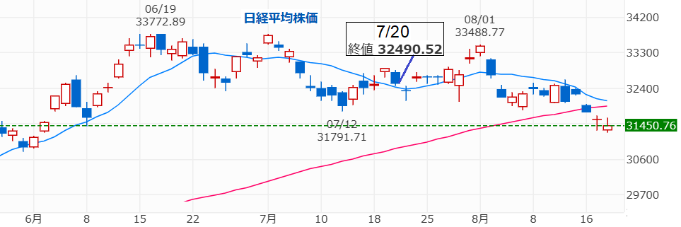 今日8/31の日経平均も4日続伸して欲しいと思いますが、それでも前月末比(33,172.22円)はマイナスになりそうです・・