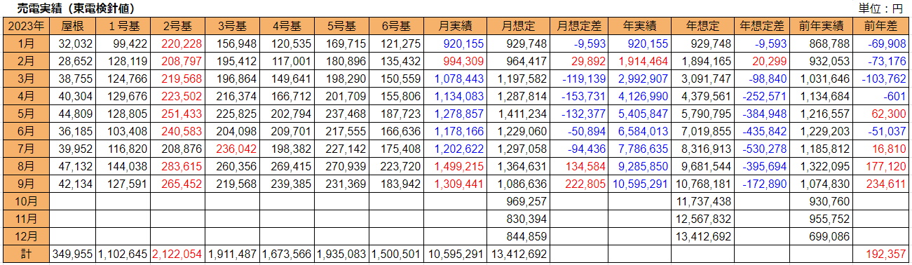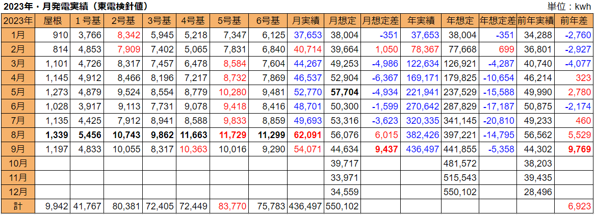 売電量は絶好調だった8月と比べると13%減少しましたが、想定比ではなんと8月を上回る +9,437kWh でした(8月は+6,015kWh)。昨対も +9,769kWh です。